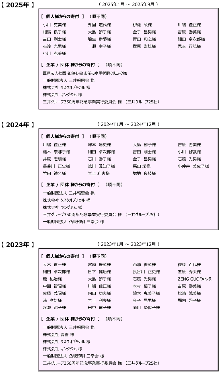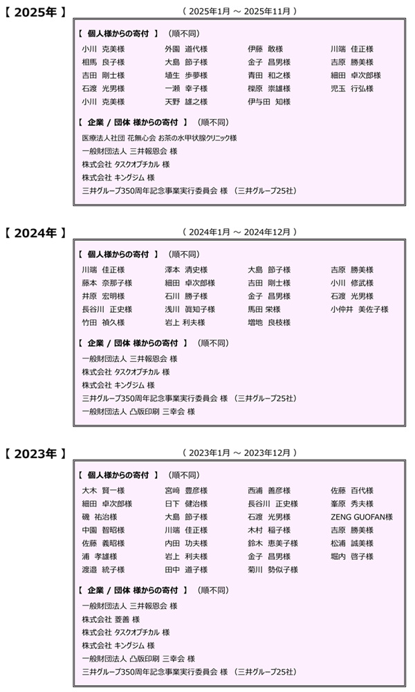 ご寄付いただきました方々への感謝の意を込め、ここにご芳名を掲載させていただきます。(公表に同意された方のみ掲載)
