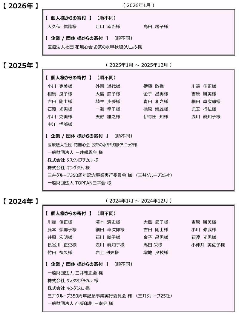 ご寄付いただきました方々への感謝の意を込め、ここにご芳名を掲載させていただきます。(公表に同意された方のみ掲載)