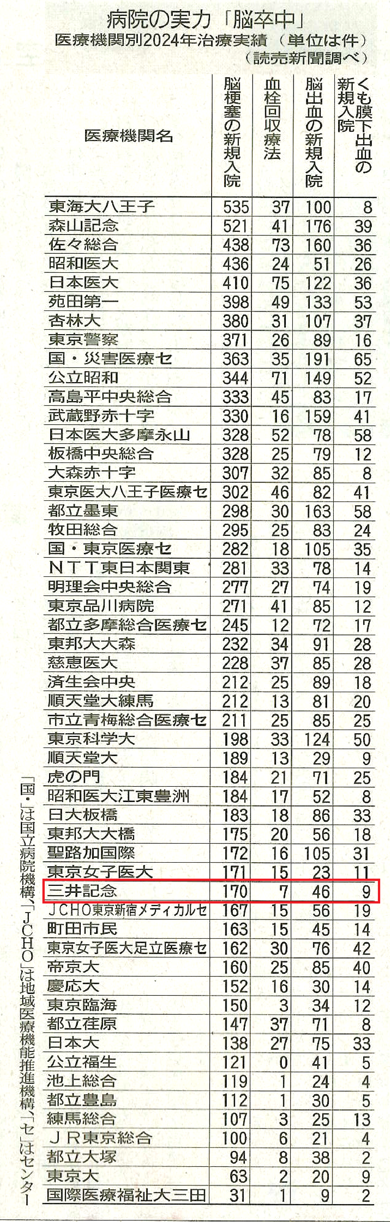読売新聞 都内版(11月23日) 病院の実力「脳卒中」に当院が治療実績のある病院として掲載されました。